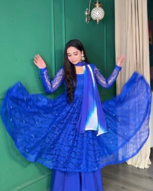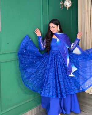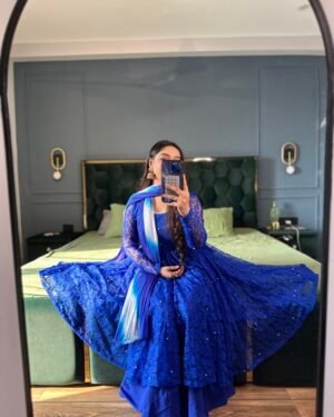 Royal Blue Net Umbrella Frock With Sharara and Dupatta