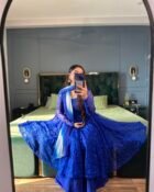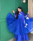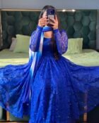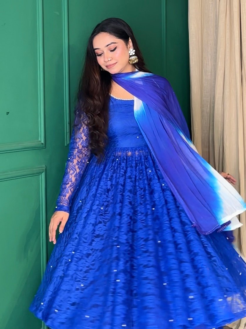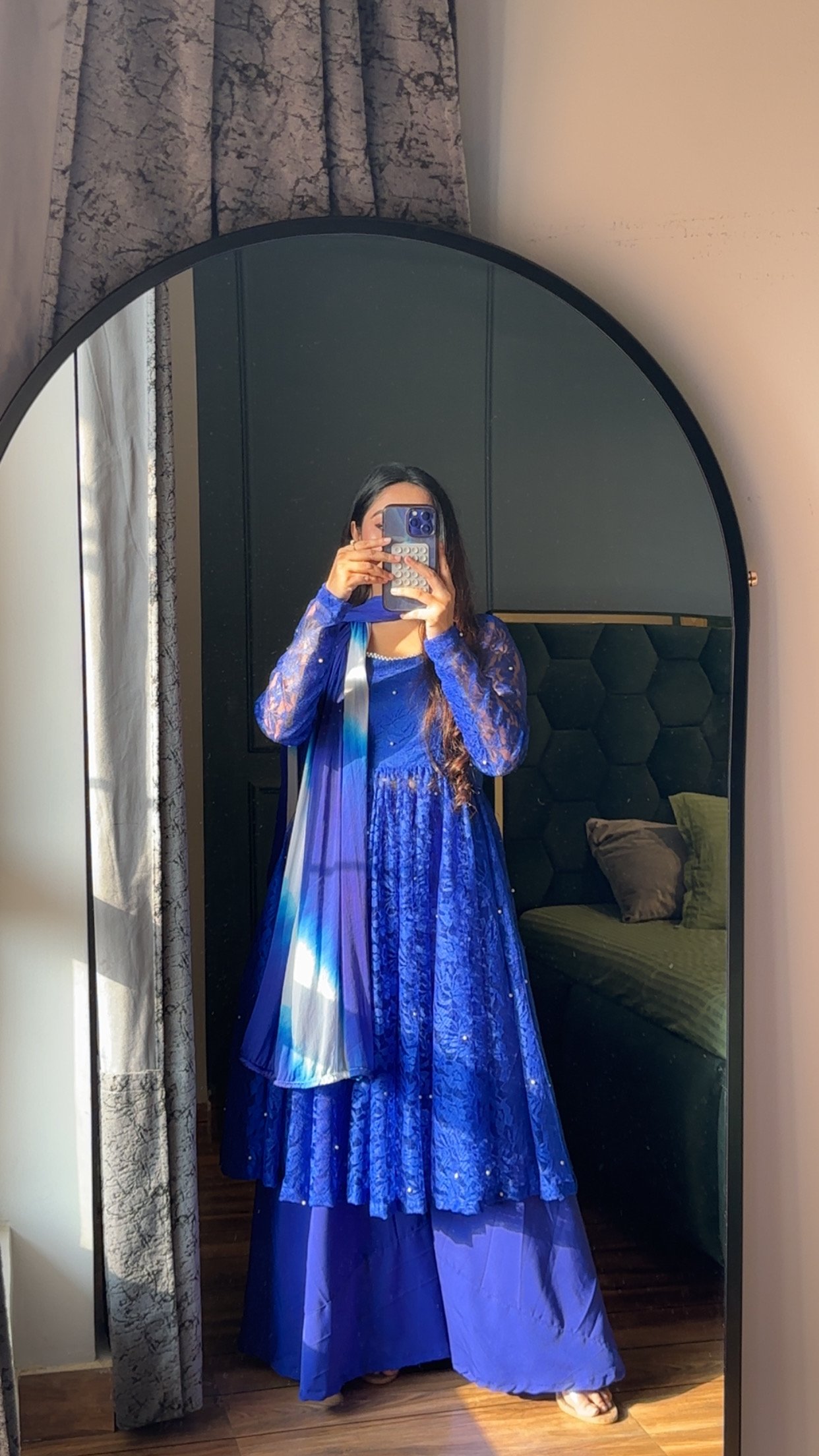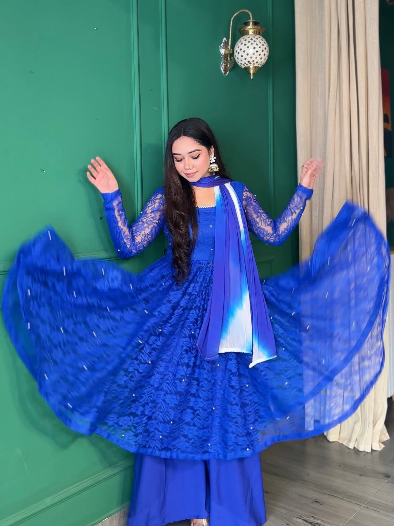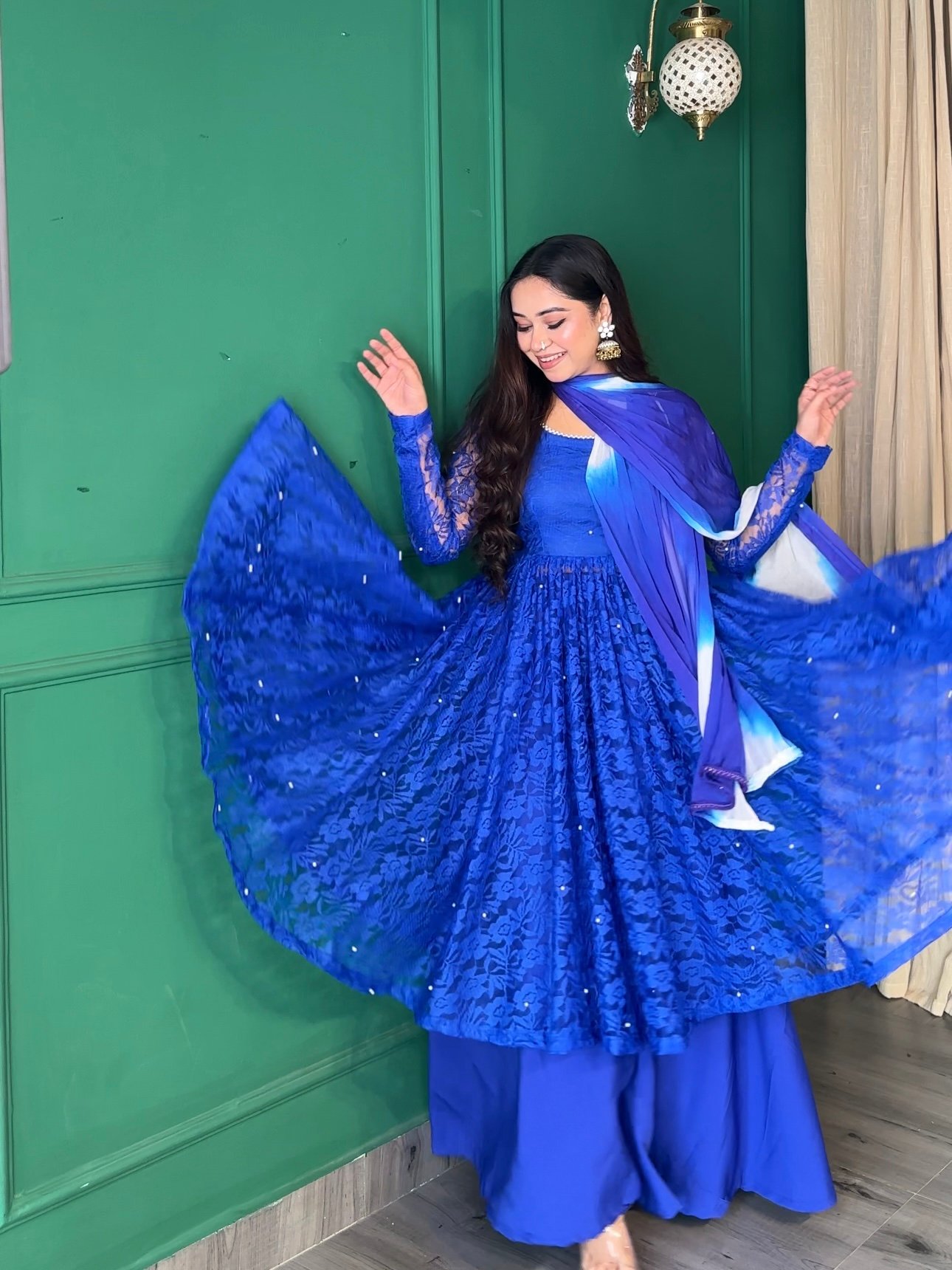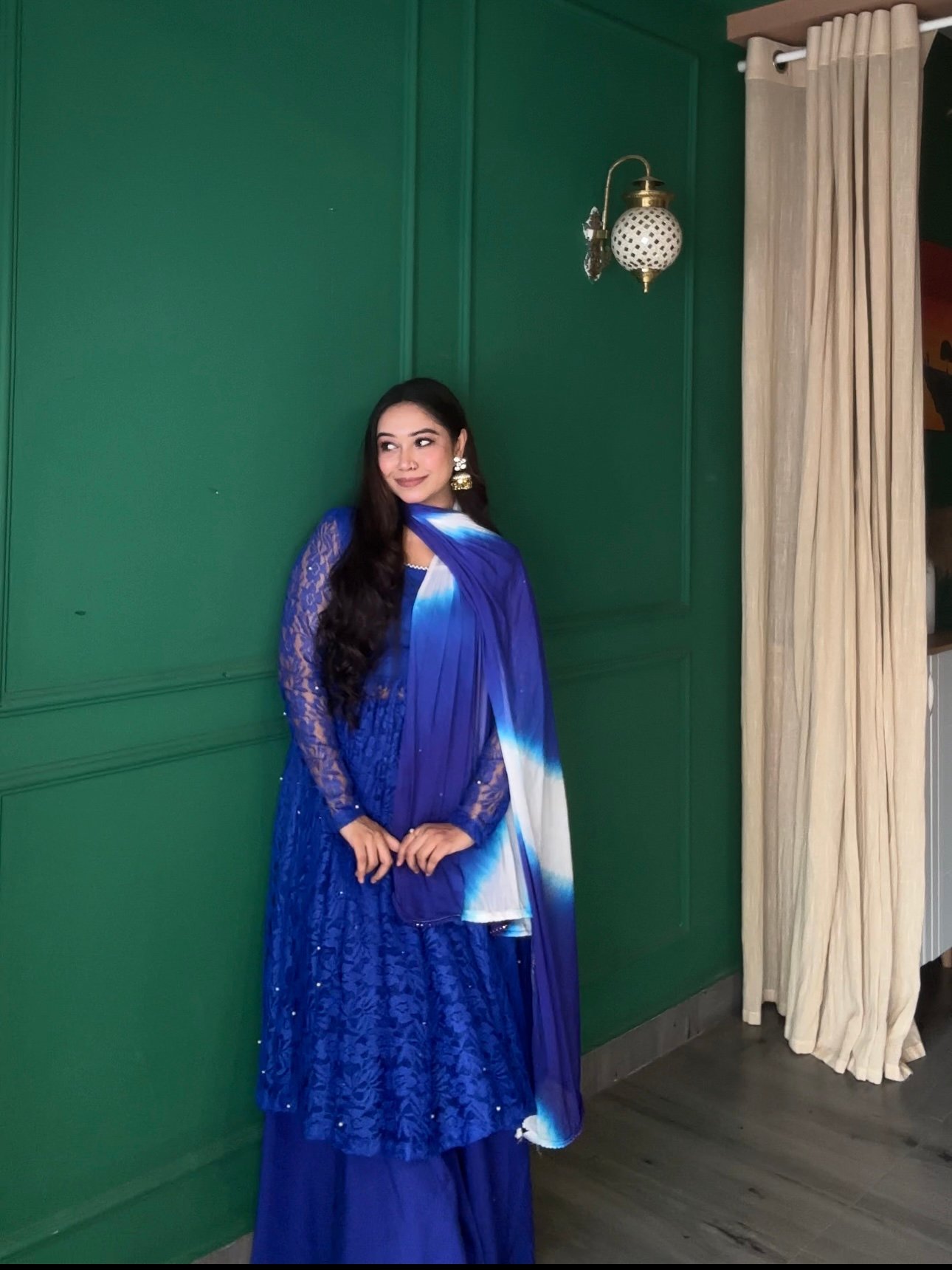 Make a grand entrance with the Attractive Net Royal Blue Umbrella Frock With Royal Blue Full Flare Sharara and Dupatta. This elegant set features a delicate net umbrella frock, paired with a stunning royal blue fox georgette full flare sharara and a soft chiffon dupatta (2.5 meters). Perfect for weddings, festivals, or any special occasion, this set brings together traditional charm with a modern touch.