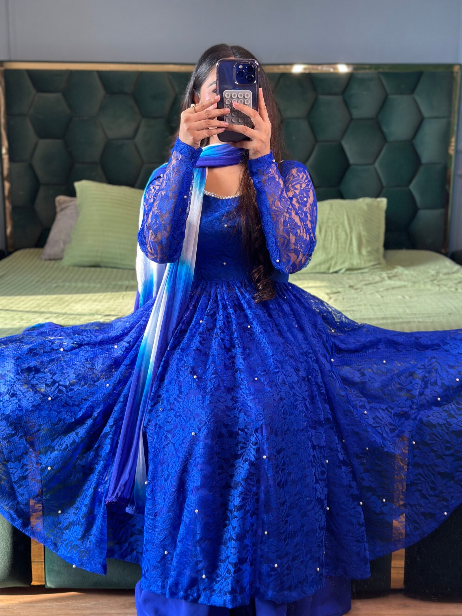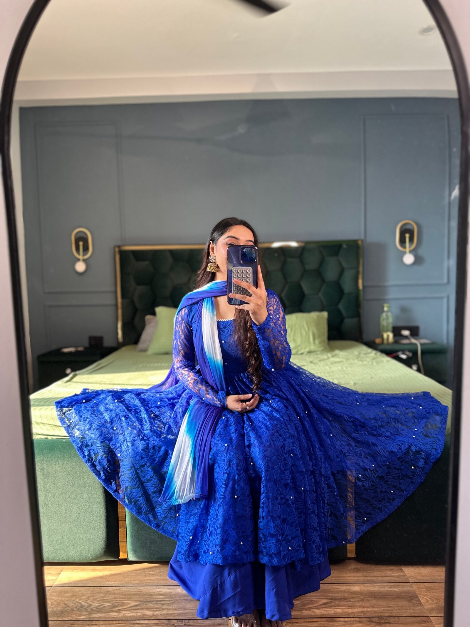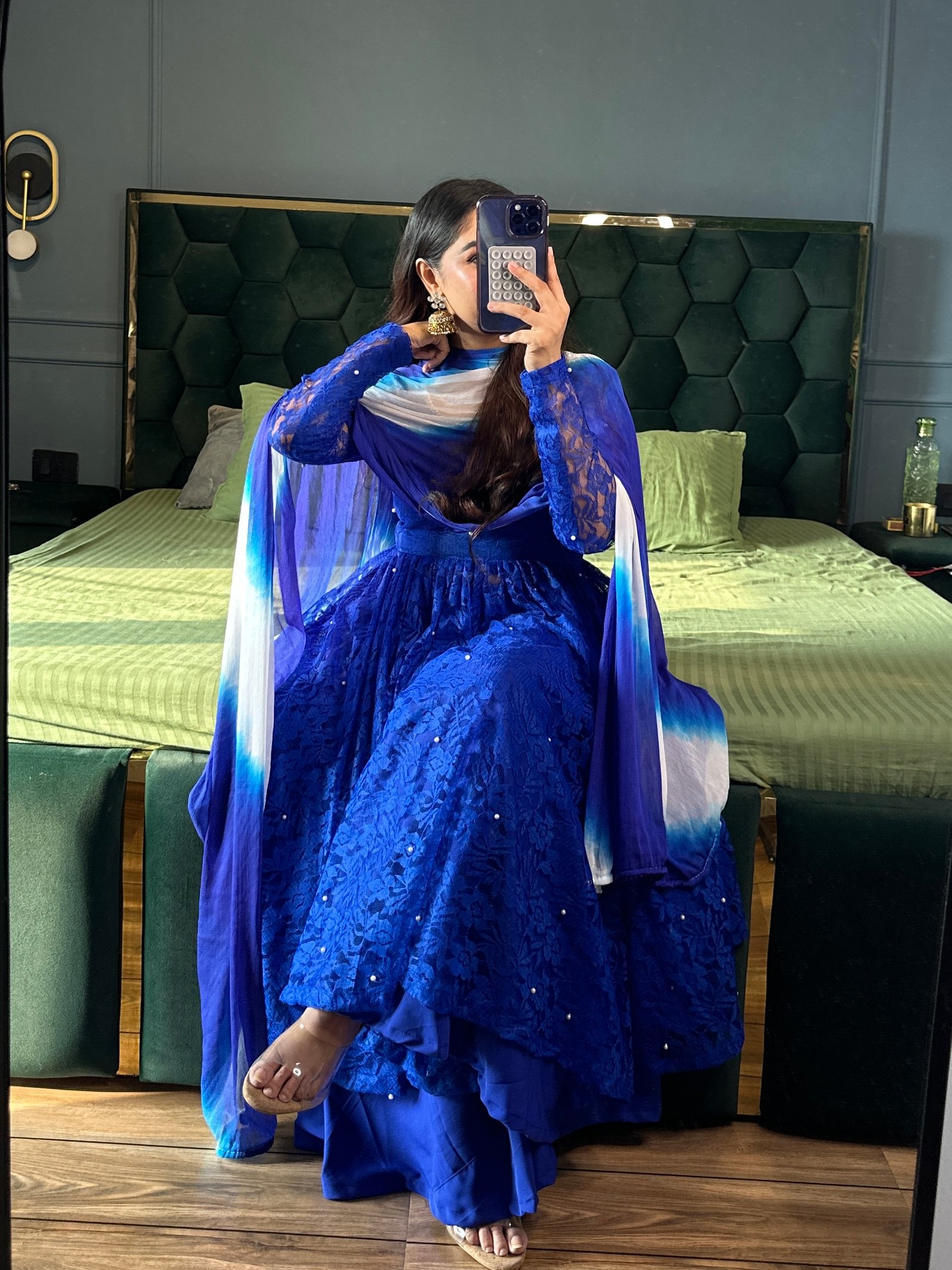 Royal Blue Net Umbrella Frock With Sharara and Dupatta
