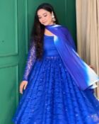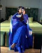 About Royal Blue Net Umbrella Frock With Sharara and Dupatta